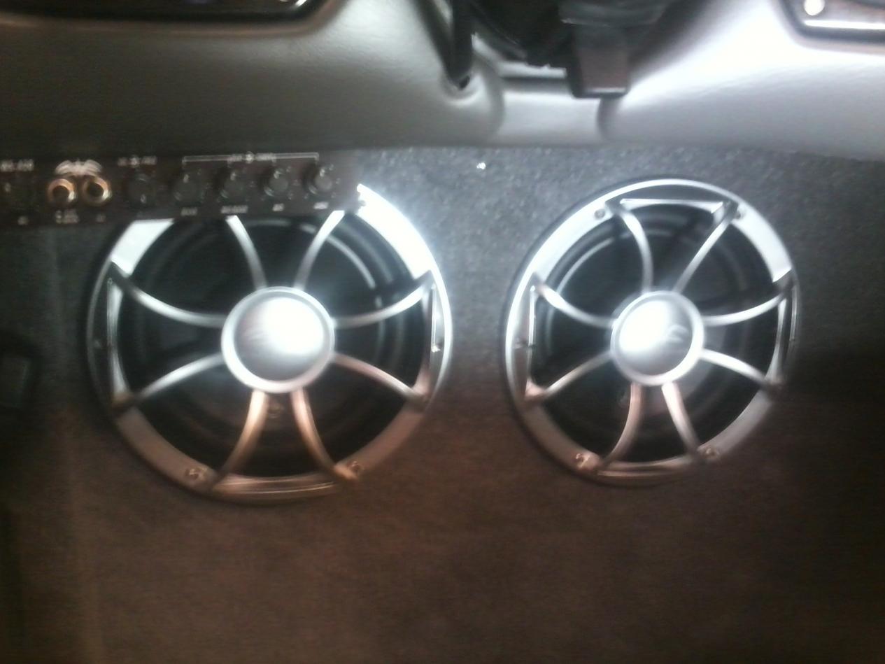 Attachment 11796 Here is a pic of 2 jl 10w3 subs under the drivers help. It was a pita with the heater vents, heat exchanger and the slopping floor. They are in a sealed enclosure at .65 cu' each. Took lots of figuring and fabbing but I think it turned out nice and sounds great. Just built a new false front and cheated with wetsounds grills to match my inboat speakers.