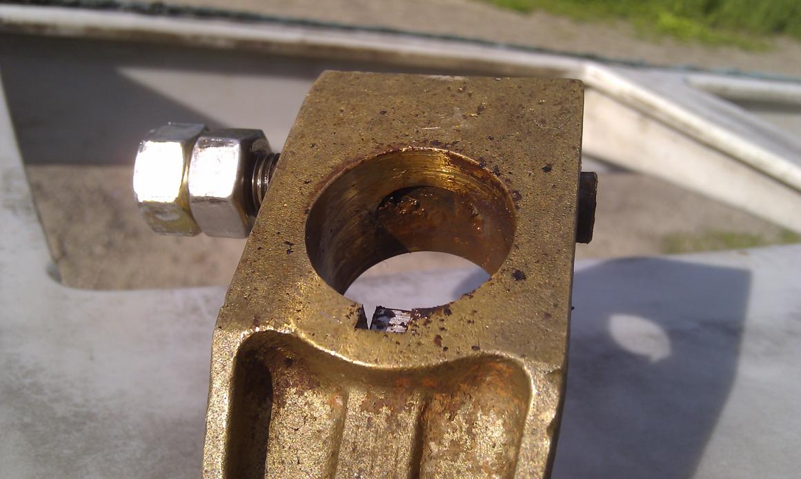 The first picture is after just a few taps; the rudder had dropped about 3/4". A few more taps and I was able to press the rudder out of the rudder box. In the 2nd picture you can see the cut out in the side of the stud. There was still a bit of crud in the assembly....neglected to clean it prior to taking a picture.