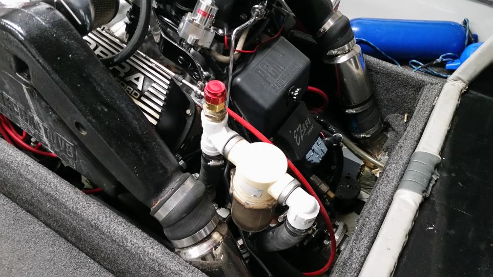 I kind of had the same concern. That's why opted to put the T between the water filter in the oil cooler. The first time I used it I really paid close attention to just how much water was getting sucked up by the raw water pump and came out of the exhaust. It turns out the pump seems to take what it needs and the left over gets flushed out of the water intake. As the RPMs are increased water flow exiting the water intake decreases by 3000 RPM 100% of the water is going into the system.. I was concerned about the system handling 60+ pounds of pressure a normal car cooling system only uses somewhere around 12 pounds. I believe in a boat the only pressure involved is how much is needed to force water into the exhaust system. Oh I see you had a big block.