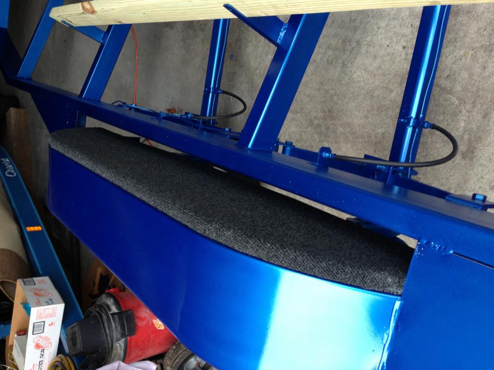 Indoor/outdoor carpet glue, applied w/a 1/8 v notch trowel. I also used 5/8" galvanized staples. I'll add some more pics of this process... First I cut out a 2'x6'x3/4" pressure treated plywood, scribed the fender profile then cut. I rough cut the bunk carpet, laid down the glue, flipped it then stapled the entire perimeter on back (tire) side. I then cut the excess carpet in the radius areas and added a few more staples. This gives a nice, wrinkle free radius.