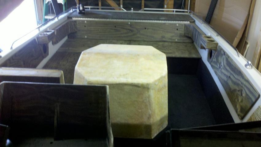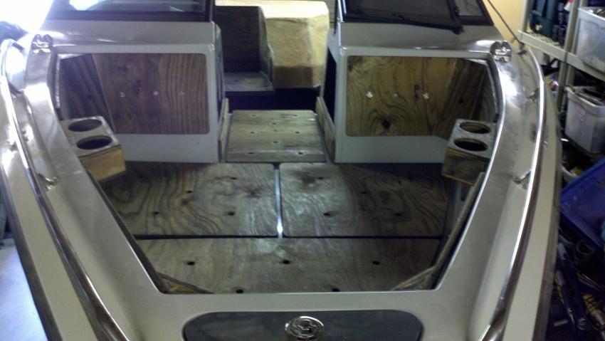 Ready to head to the upholsterer - once the better half blesses the colors and design (could be a major delay). Carpeted the seat bases & bolted in. The rear bench is "convertible" like the Outback so it can sit down on the base as a seat (with room for ballast bags half full), or raised up level with the ski locker lid for double the sundeck (full ballast underneath) - hence the funky looking arm rests. The rear bench ended up being too wide to handle & clear the cupholders and engine cover - so, split it in half. Once the interior is done, I'll fab some hinged supports under each half to support the middle cut edges in the "up" position.