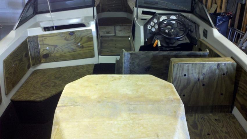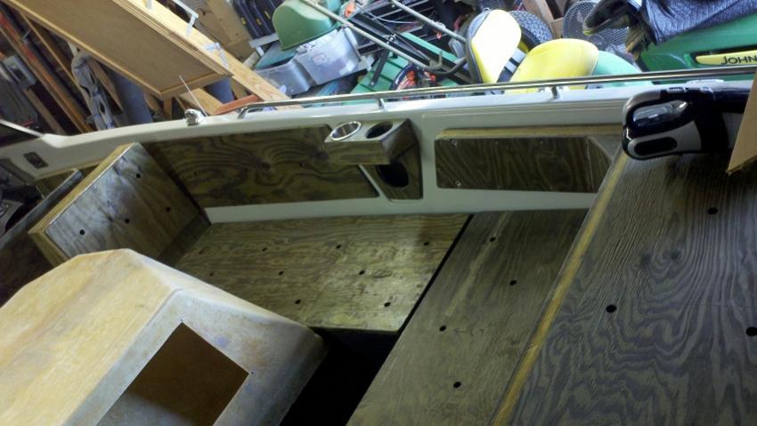 Well, been away for awhile. Job change last Nov/Dec has me working crazy hours. Had a little break & made a little progress. Finished all the seat bases, redesigned rear bench back, ski locker cover, drivers seat, and cup holders. All PT plywood with 2 coats of CPES - I don't want to face wood rot again! Still need to finish the base tops and cover the bases with carpet and make the seat backs before I can take it to the upholsterer.