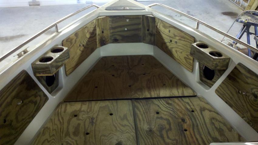 I wanted the larger s/s cup holders, but couldn't make them fit in the original plastic pods - so fabbed new pods from scratch. A PITA, but think they'll work well. Also thinking I'll run some fiberglass tape around the seams of the driver's seat just to reinforce the PL, s/s screws and staples. I added some backers behind the skirt in a few places so I can through bolt the bases - no screws into my new floor.