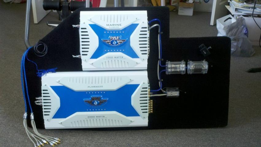 My eBay special Tsunami kit had a voltmeter, so figured why not mount it - kinda cool I guess. I made an angled mount for the PAC LC-1 (that will control the towers on the top amp) to point the knob towards the driver for easier adjustment. The bottom amp is a 6 channel - 1,2,3,&4 for the cabin speakers and 5&6 bridged for the sub. Yeah, they're cheap Pyle (pile of s%$#) amps, but for 100 bucks at a close out sale - what the hell... Have no idea how good it'll sound, but at least the kids will dig the little power level led's and think dad is cool. Since the speaker/power connections are down by the driver's feet, I'll probably make a bolt on plexiglass cover for that end so nothing unexpectedly exciting happens :)