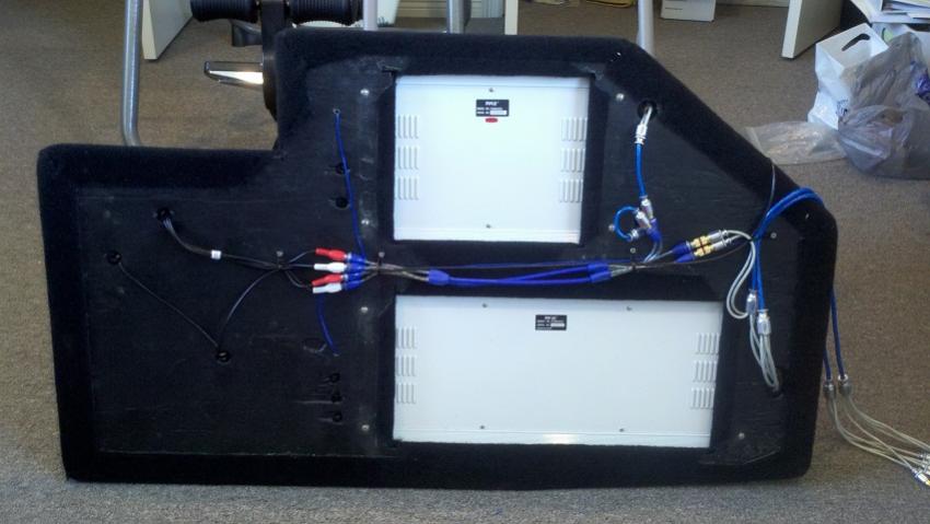 Finished loading up & prewiring the amp rack. All that's left is connect the pos, neg, and speakers. Well, and mount the radio, build the sub box, mount the speakers, run the tower wires, etc, etc, etc. - but gave me something to do while they work on the interior foam & vinyl.