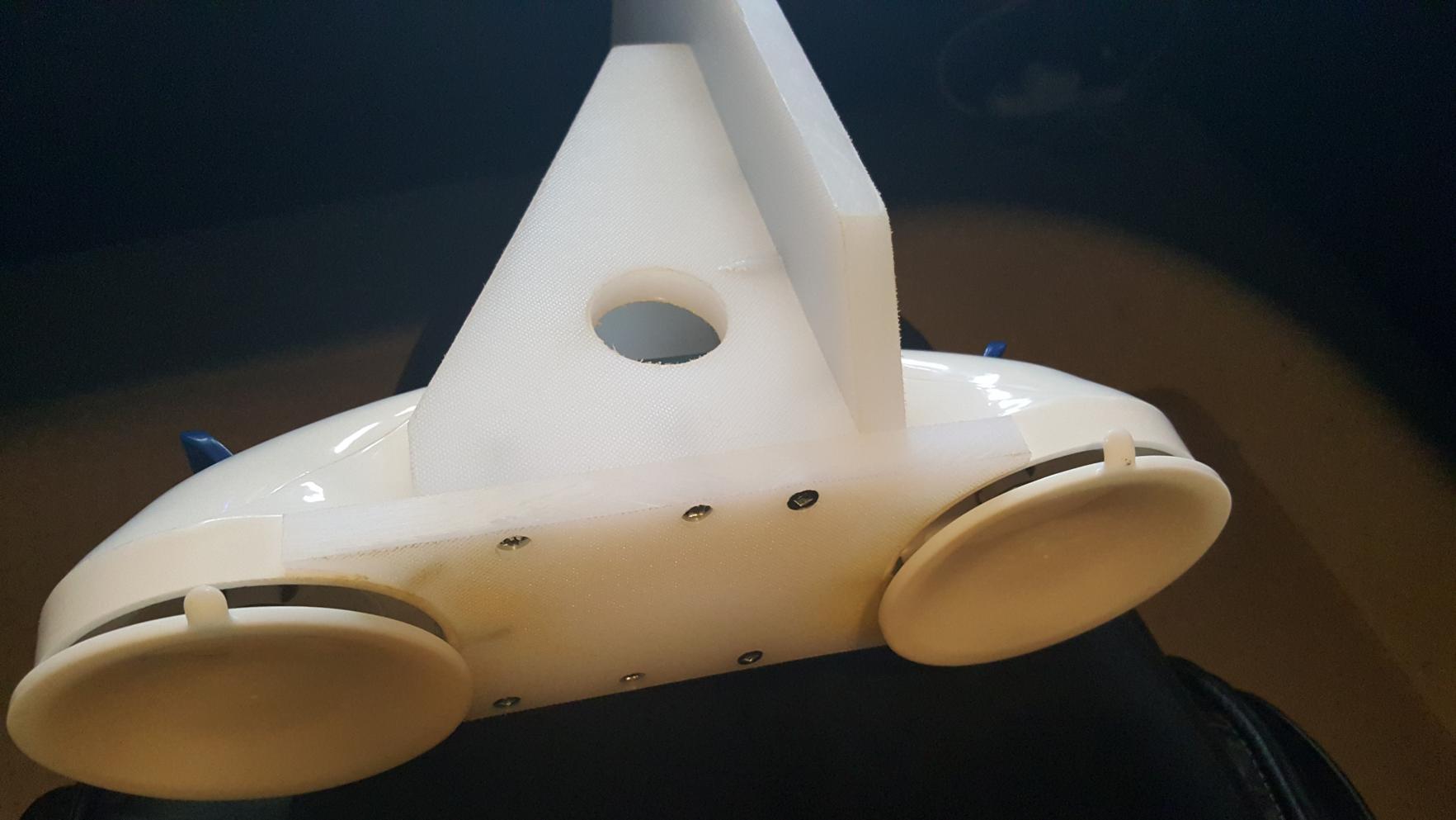 I would think blade in front would push suction cups against boat while blade in back would have a tendency to pull them outward. Maybe not though since yours is working.