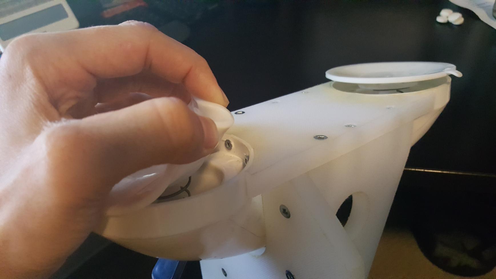 You need to take the suction cups off and then screw it in from the inside. It takes 2 people to get the pins out of the handle but it's pretty easy. It's a bit tricky to get the screws in through. I used a drill bit to make the pilot hole then used a ratchet with a drill bit at the end to get the screw in since you can't use a drill. I used a 3 1/2 hole saw and fits perfectly.