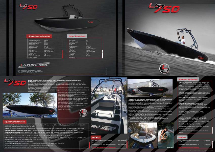 The open sports LSx750 is undoubtedly the boat of the future at the forefront of technology, powerful, economical and ecological.Indeed, waterjet propulsion divided by more than three weight compared to fiberglass boats equipped with outboard motors and therefore allows great fuel economy and increased power.An unsinkable boat with its hull completely foamed polyurethane with closed cell, fully soundproofed, self-draining.Suitable for different navigation programs such as fishing, diving, transport, walks and water sports of all kinds.Turbines with independent steerable nozzles ideal for water sports with the creation of a so-called artificial wave.LSx750 of transport can be performed with a single-axle trailer with a road width of 2.5m wide making it easy to move.Kerb weight 1300kg with a trailer so ideal for light vehicles.A waterline length of less than 6m, not francisation therefore no additional cost in terms of annual fee.