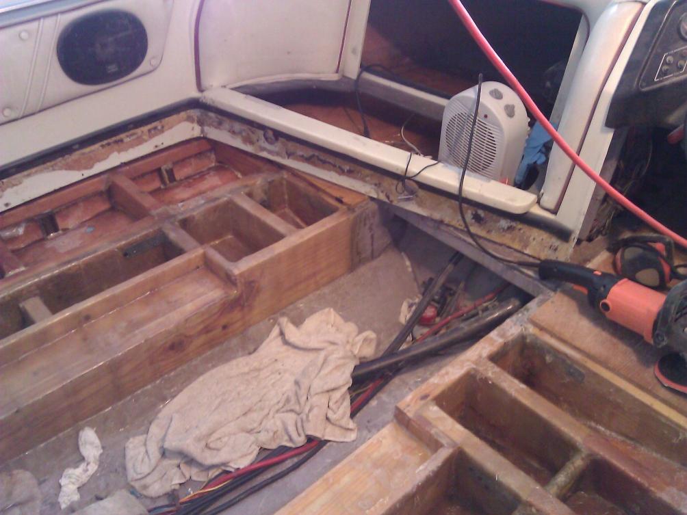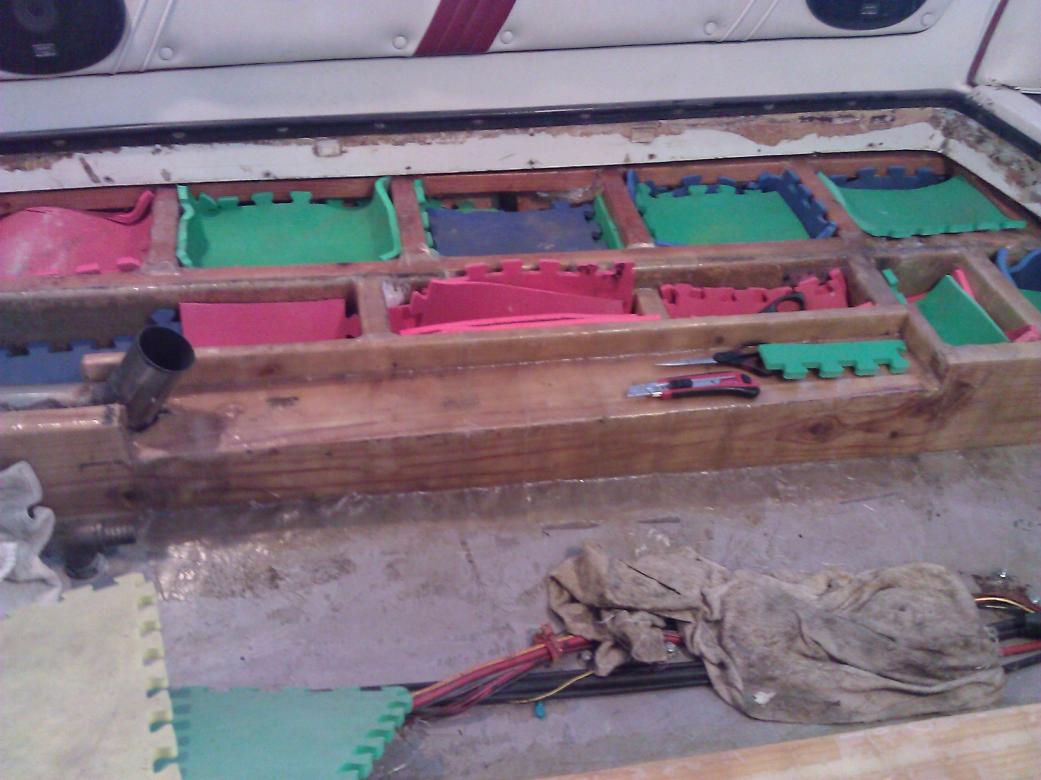 Update photos. The floor should be done today?? (fingers crossed) I found some water proof sound insulation laying around. lol. Yes, I recycle. I also made the floor to slightly slant to the center so water will flow to the center area or the bilge. Attachment 9200
