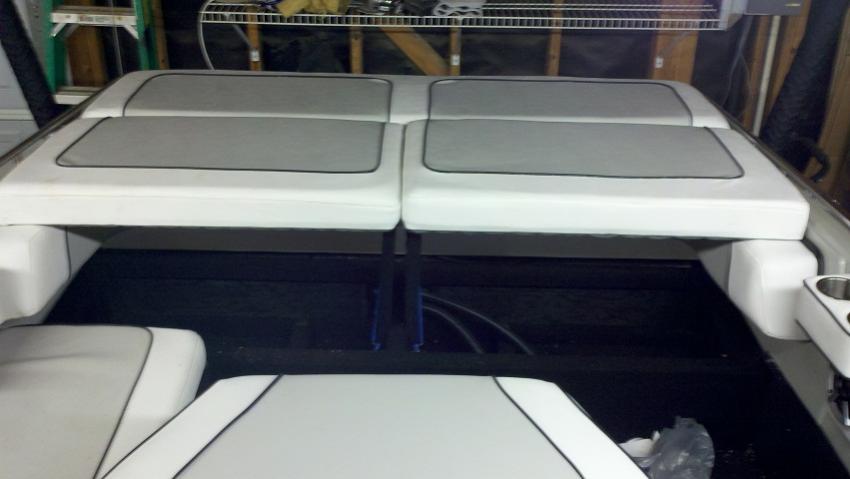 Upholterer is taking longer than expected (suprise?) & running out of things to do while waiting. Finished the other locker trim, completed the sub, & prewired a tower speaker harness and connector. Pulled out this old yucky yellowsih orangish bimini that came with the boat.