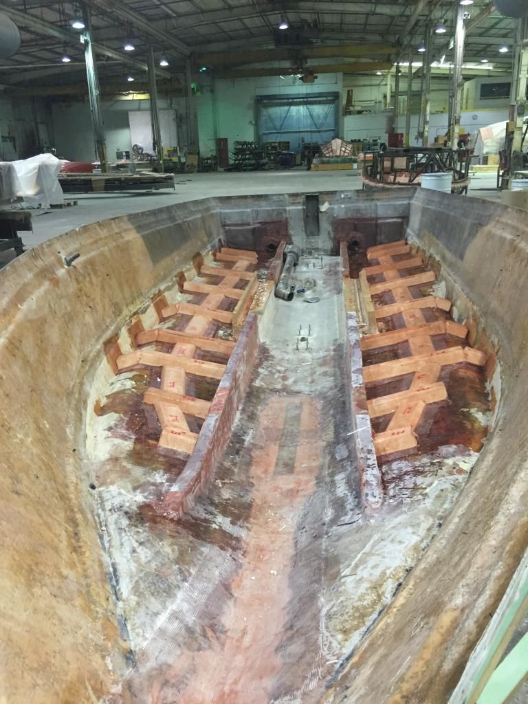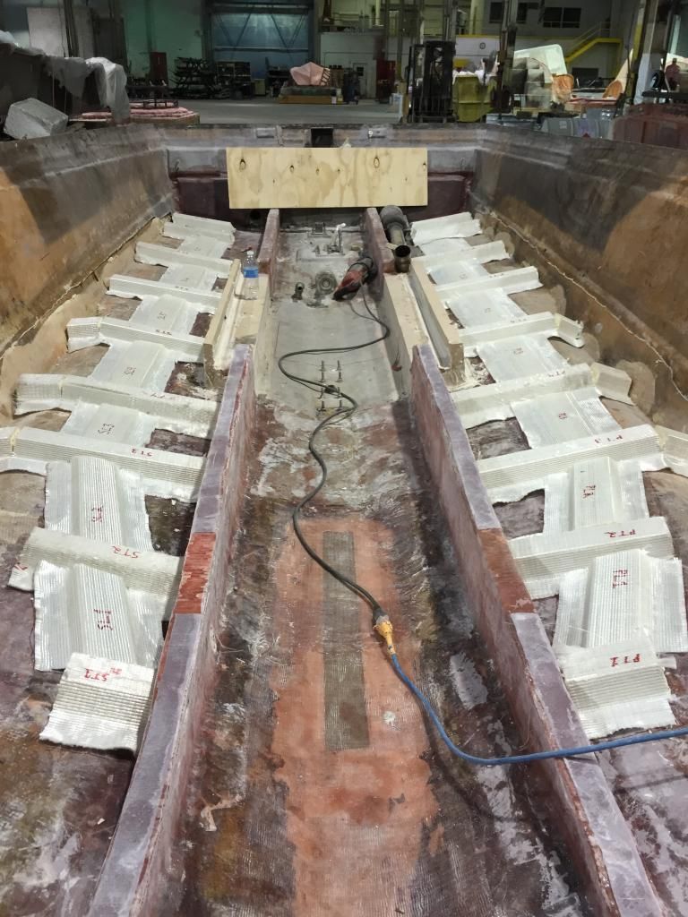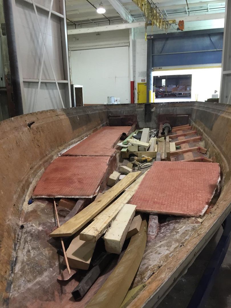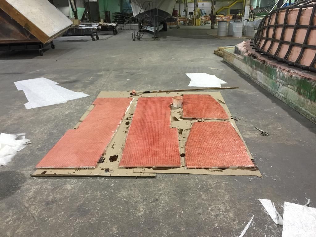 Here is my dry fit layout. To get a good bond to the hull, I am using a 36 grit sander to scuff the contact areas. I am also laying down a 2 oz csm to embed these preforms. All the stringers will be covered with a final layer of 3610.