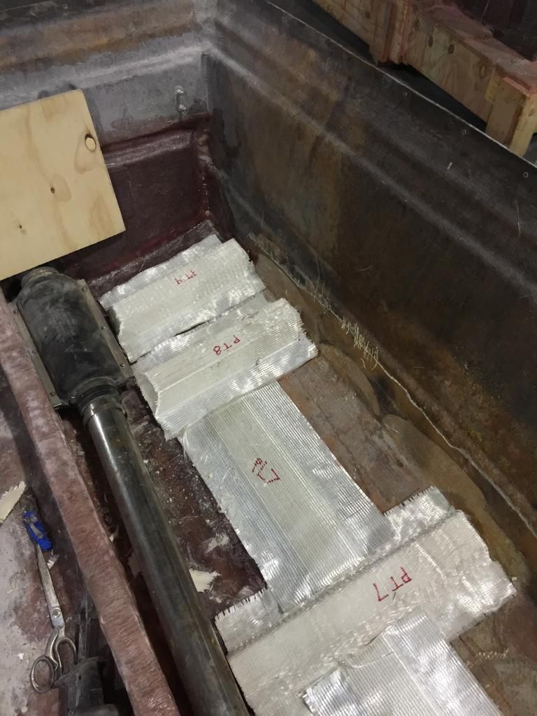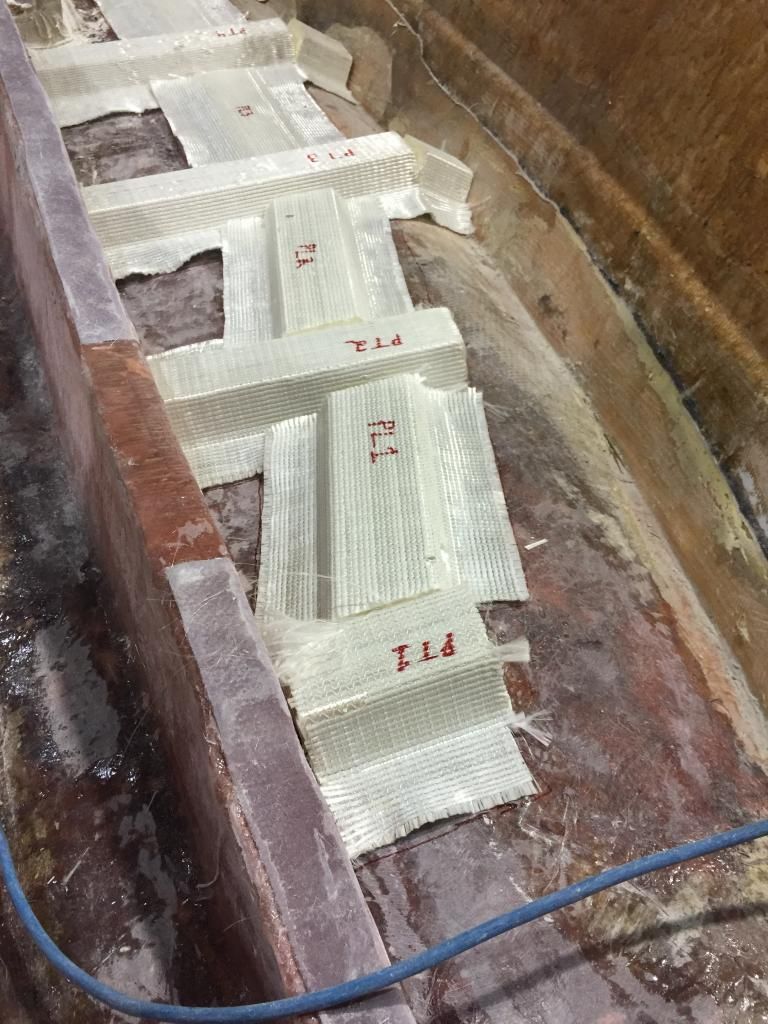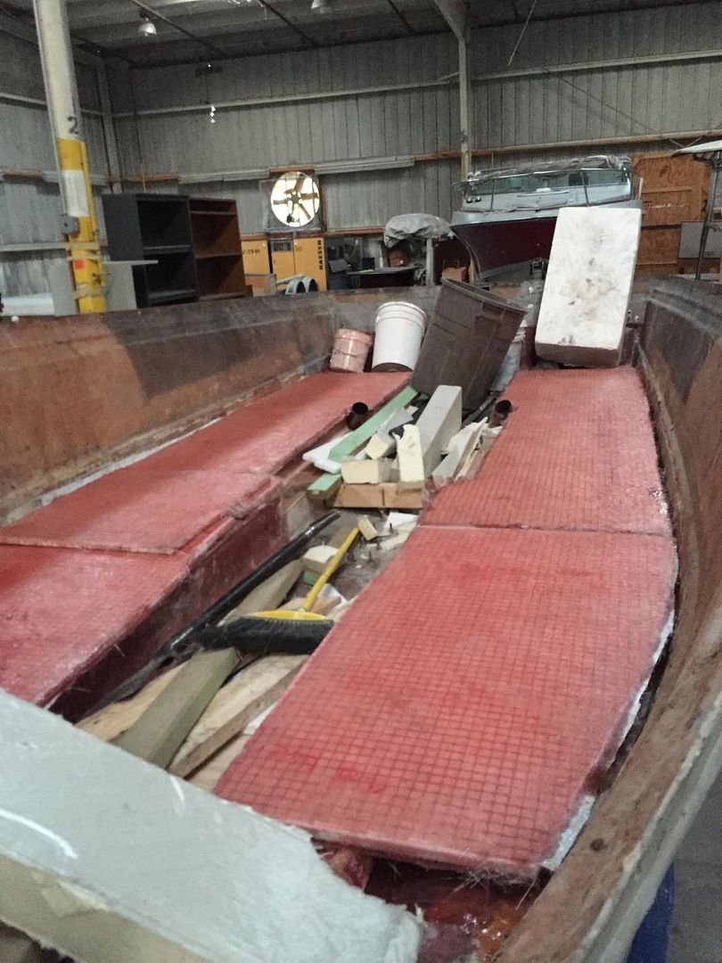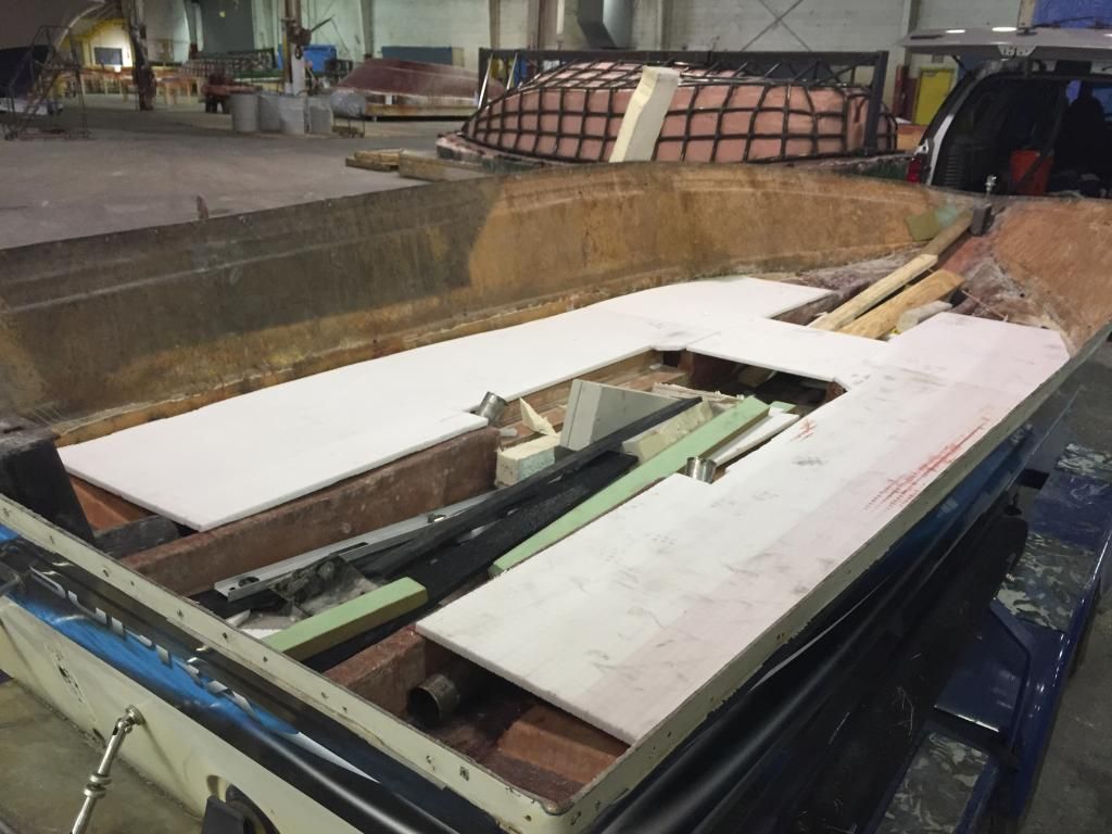 Here is my dry fit layout. To get a good bond to the hull, I am using a 36 grit sander to scuff the contact areas. I am also laying down a 2 oz csm to embed these preforms. All the stringers will be covered with a final layer of 3610.