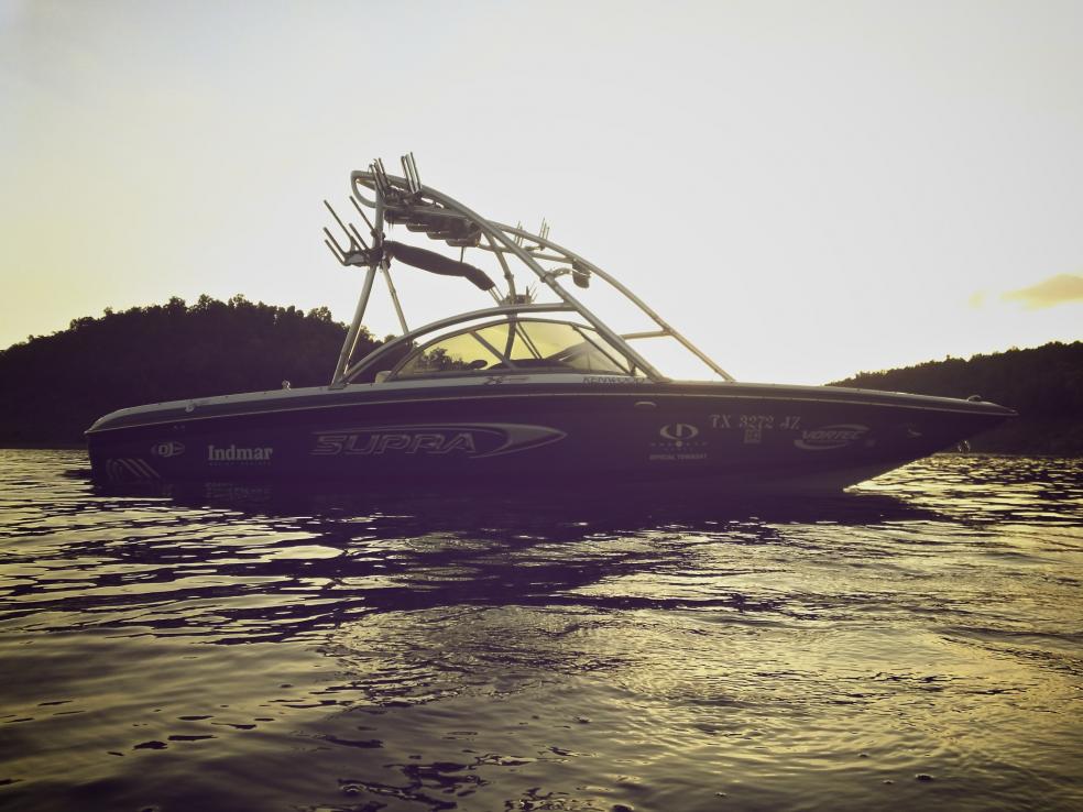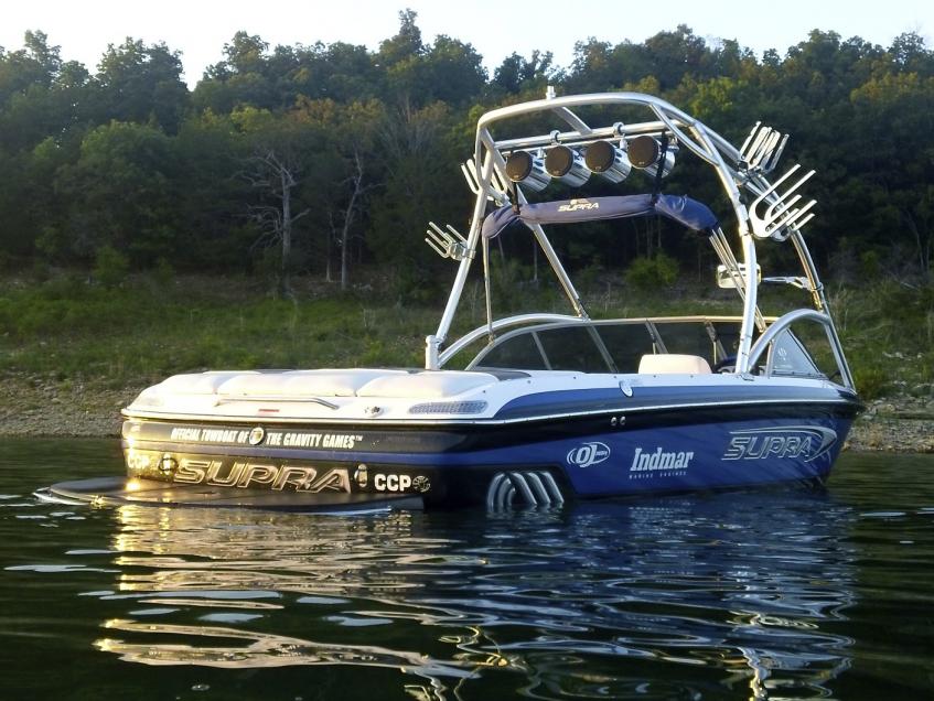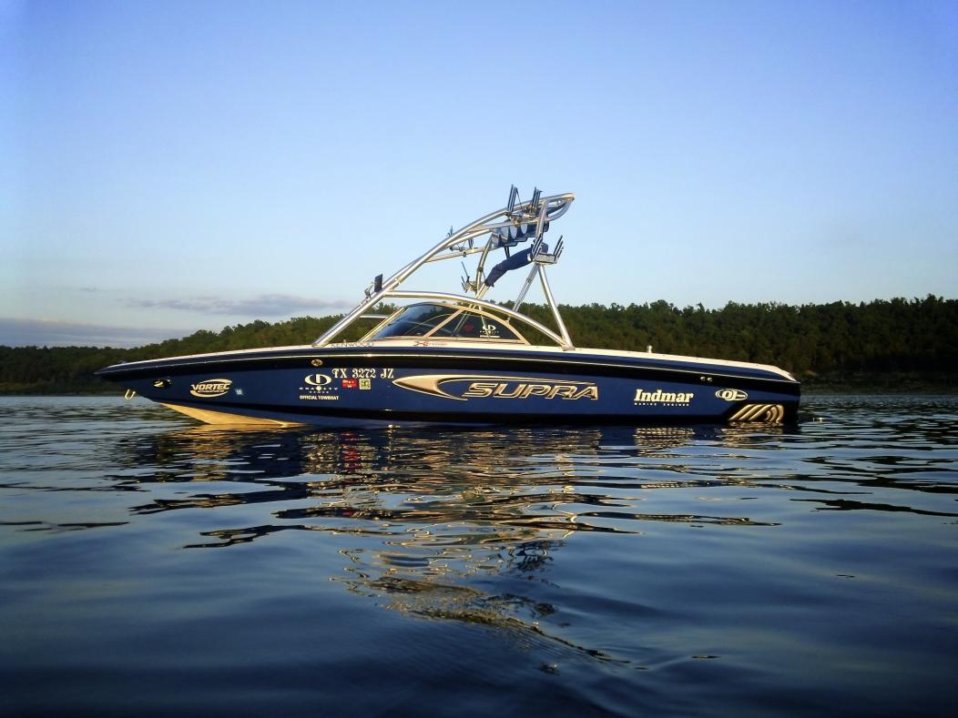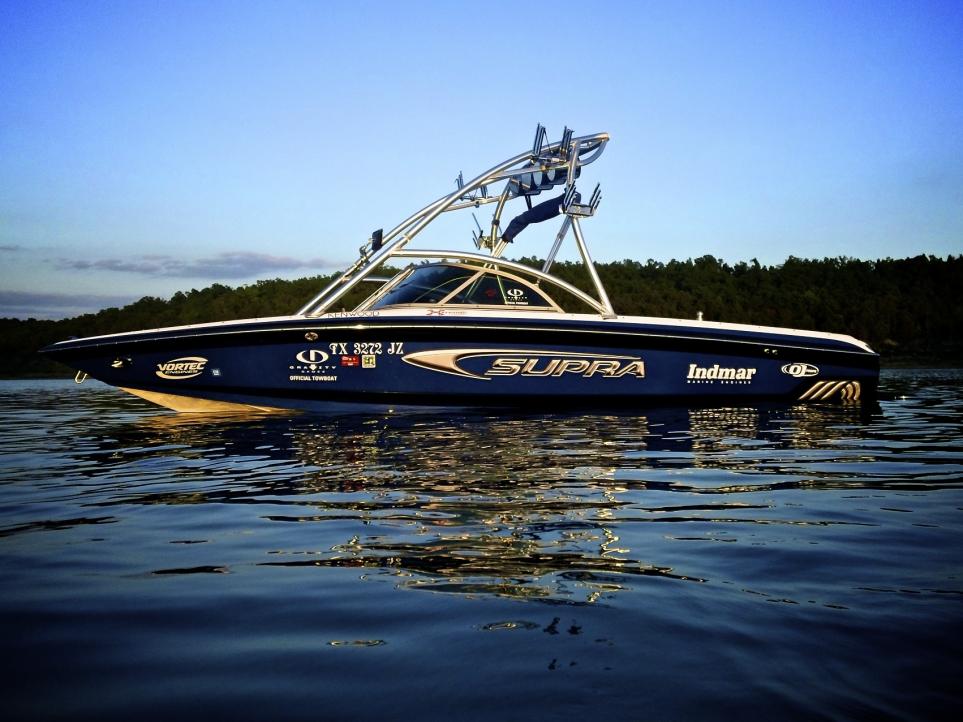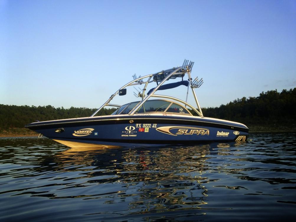Here she is, she is my first Supra that I have owned. She is a 2004 22SSV Gravity Games Edition. I just put her in the water for the first time tonight. Modifications to the boat include 2 extra board racks, blue LED's throughout the whole boat (16 LED's Total), she really glows blue at night. Future projects include, LED kit for the trailer, new sound system. That is all for now but I am sure there will be more. Enjoy!